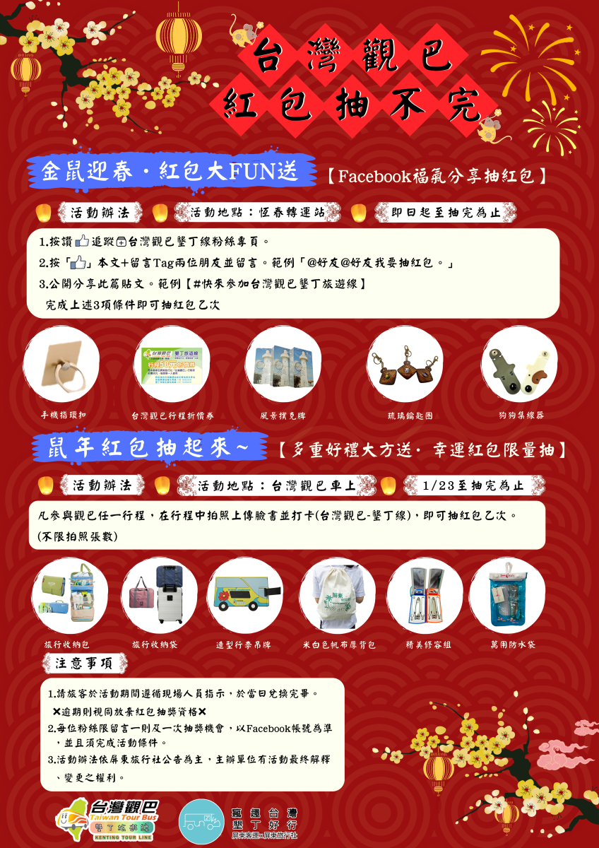 凡參與觀巴任一行程,在行程當中拍照臉書上傳打卡(台灣觀巴-墾丁線),即可抽紅包乙次。