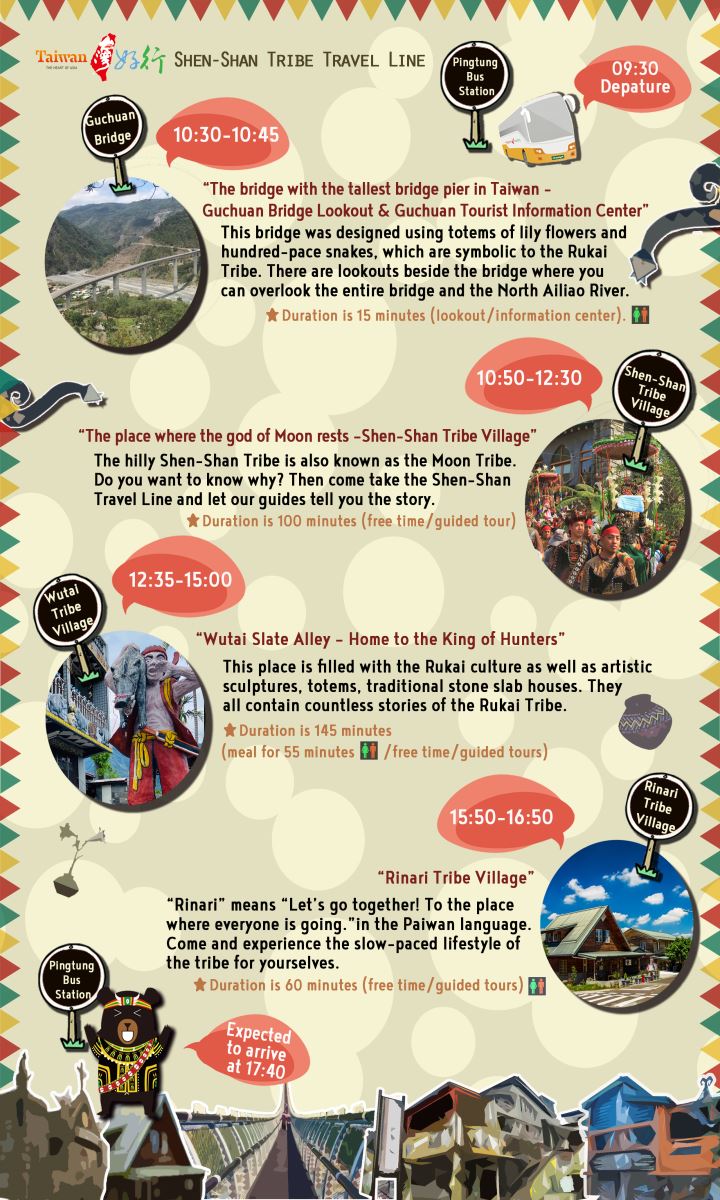 3. The stops of this travel line include Guchuan Bridge, Shen-Shan Tribe Village, Wutai Tribe Village, Rinari Tribe Village. Every time you hop off the bus, please show your bus tickets to hop back on.