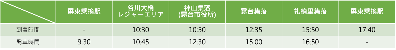 3.このルートの各停留場は谷川大橋、神山集落、霧台集落、礼納里集落です。毎回降りた後、次乗る時に運転士に乗車券をお見せください。