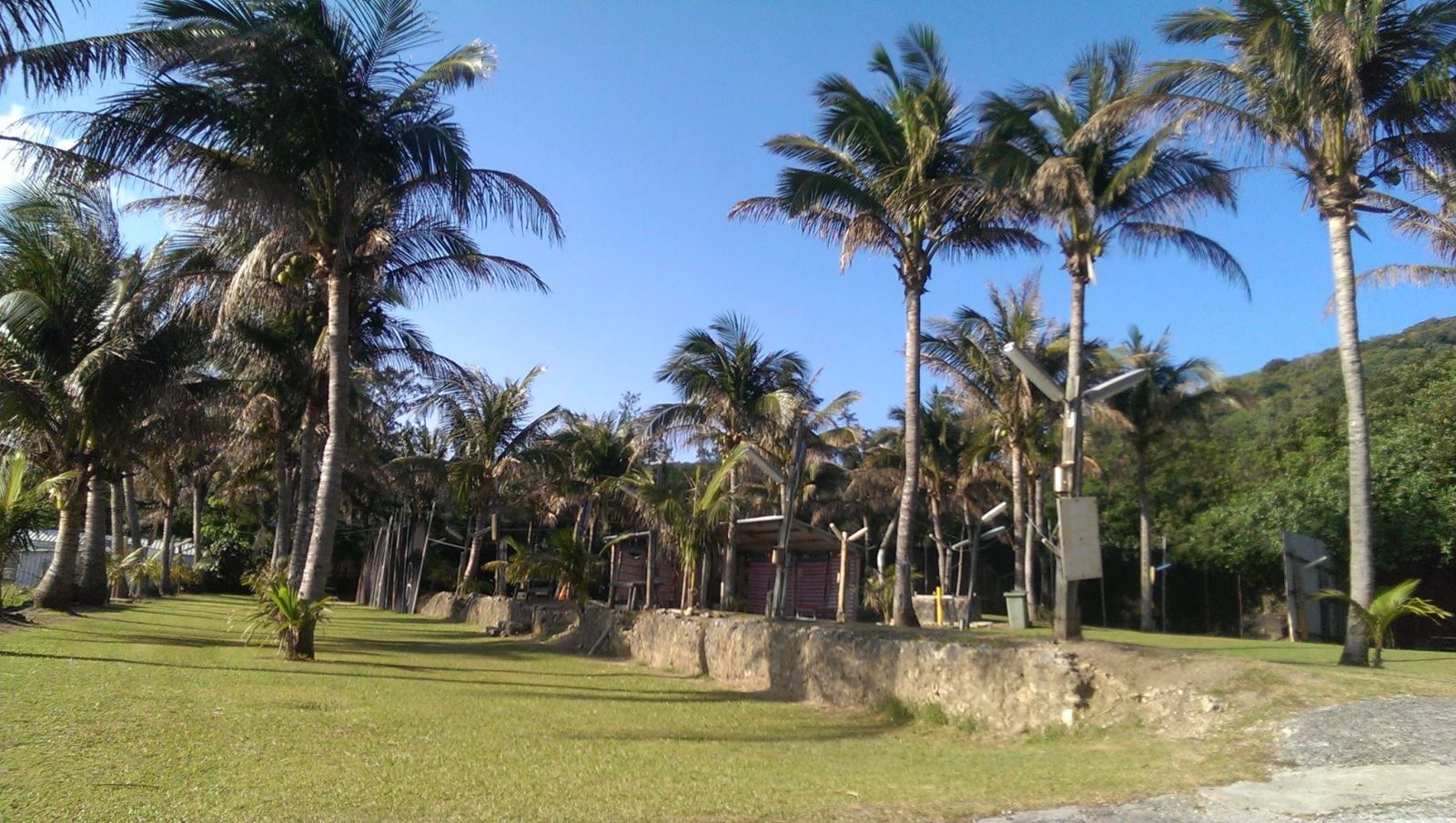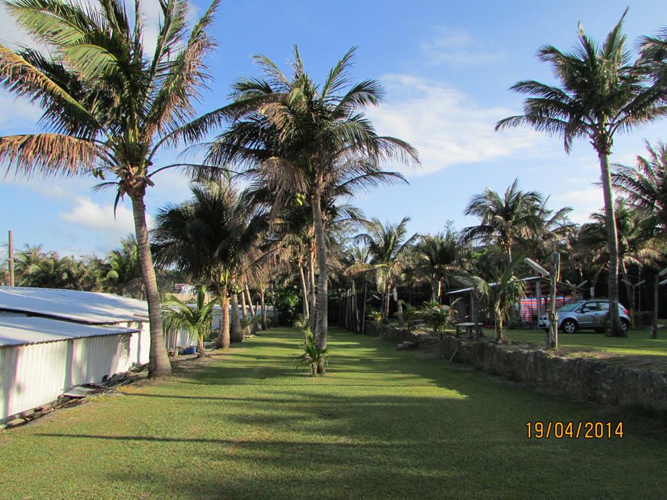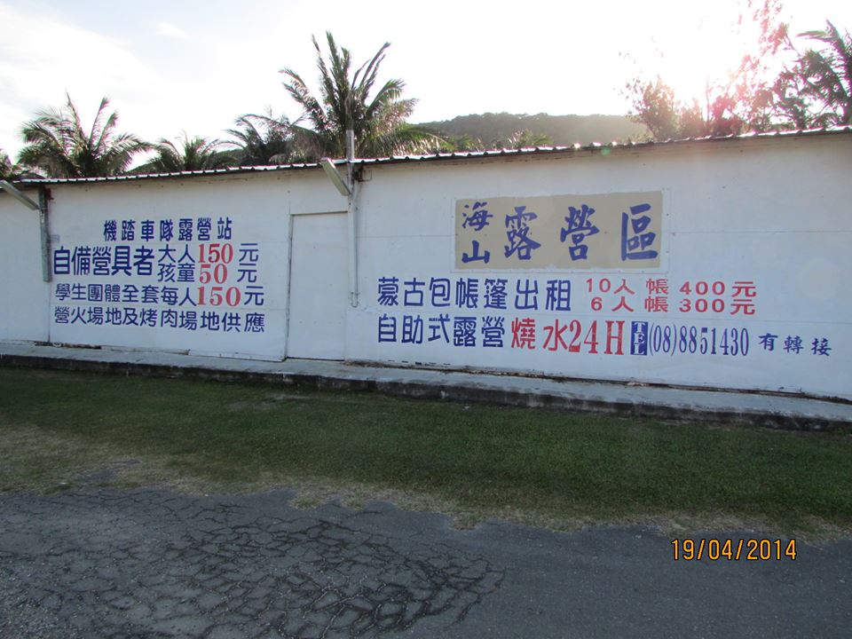 【海山露營區】位於砂島展示館往前行70公尺,屬於墾丁老字號露營區;老板非常親切、好客,營區內出租八人帳400元、六人帳300元(含睡袋、睡墊),場地費大人150元小孩100元(含帳棚、睡袋、睡墊),烤肉場地出借每人50元,炊具免費借用,熱水24小時供應