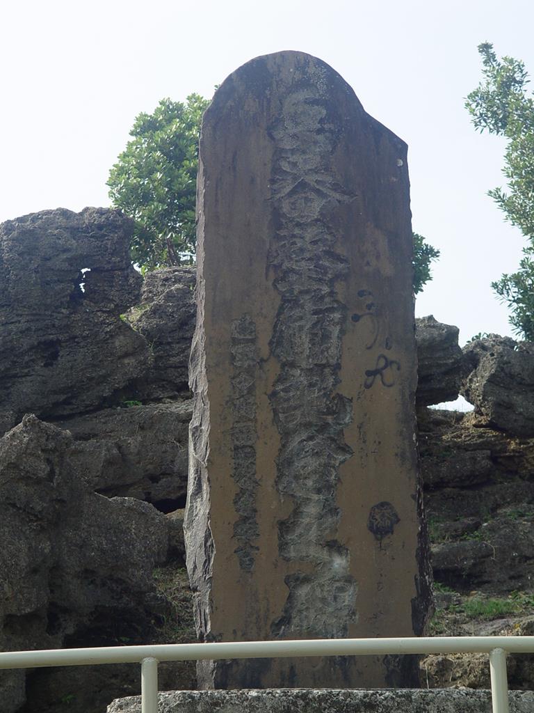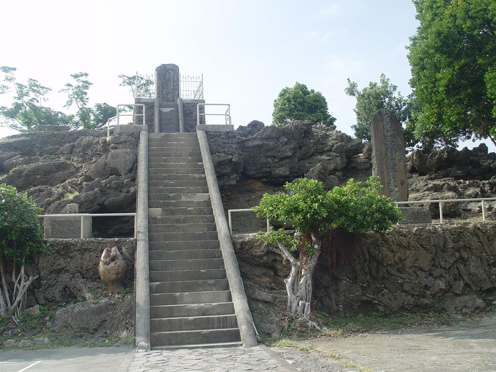 歷史不是只有文字書寫的單一形式。廣寧宮上方,以珊瑚礁岩地質為主,人稱為石碑公園的猴洞山,就是以建物書寫歷史的例子。這裡曾經有過戰爭,曾經有許多人命喪於此,許多飄洋過海參與這場身不由己的戰役的年輕人,從此與親人天人永隔,這些亡靈,被集中供奉於石碑下謂之忠魂碑,忠魂碑與其下方豎立的兵器整備紀念碑都是日據時期的遺址。只是疏於管理維護,碑上字跡如今已模糊難辨。