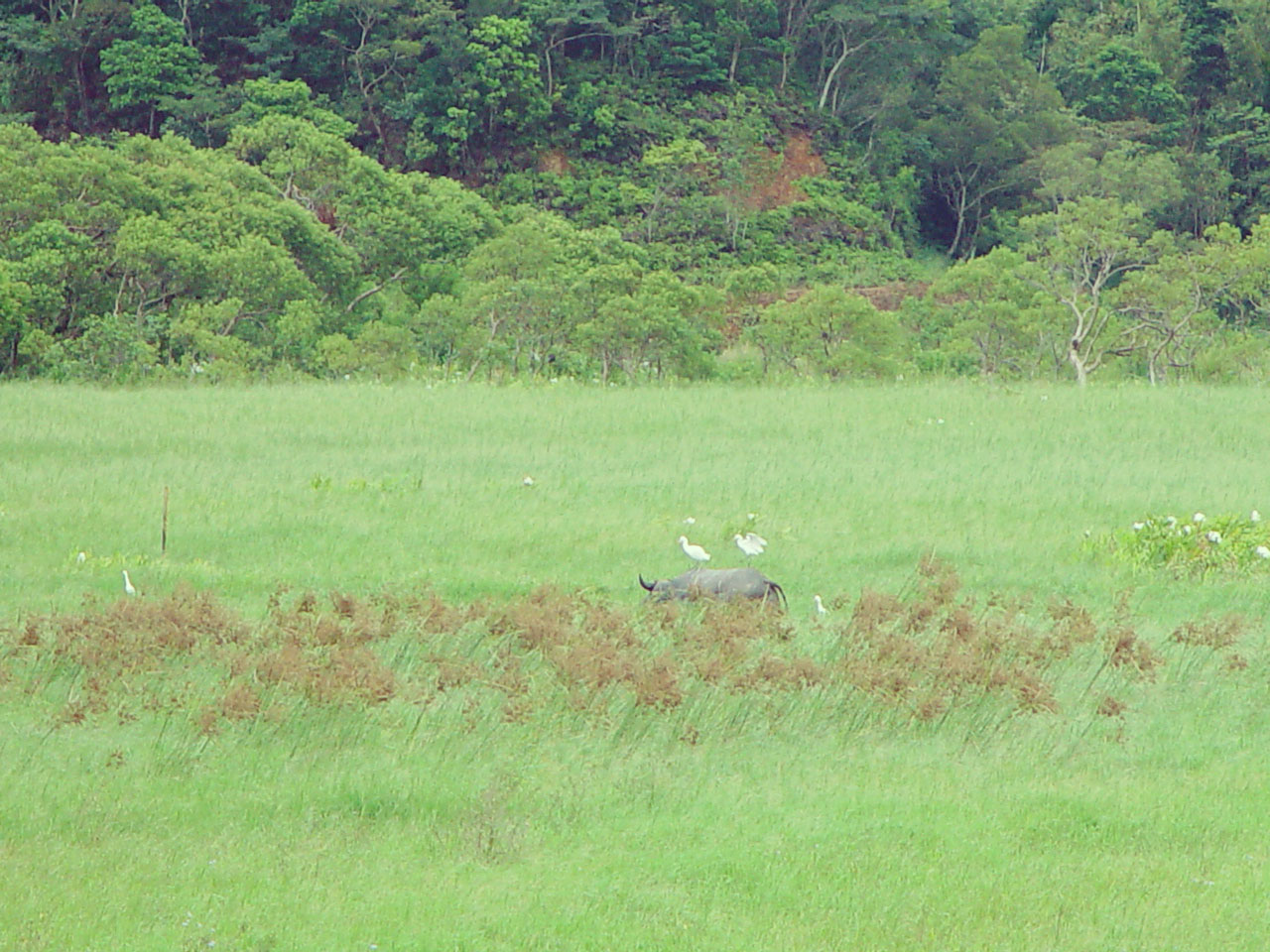 牛群大都是水牛,現世的牛群無須像牠們老祖先般的辛勤墾地,生活的內容就是一步步的拖磨、悠閒的吃草。天空一片澄藍,雲朵日日在上空款擺出不同的舞步。牛兒旁常依傍著黃頭鷺(亦稱牛背鷺)與大捲尾,夏令時牛背鷺頂著一頭金髮,秋風一掃,金髮就退了色,外觀看起來就像中白鷺;大捲尾就是俗稱烏鶖的鳥兒,領域性極強,只要侵犯到牠的天空,就連猛禽都難逃牠的驅逐;在這兒,牛鳥間卻是一片祥和,鳥兒跟著牛亦步亦趨,時而啄啄牛背上的蚊蠅,時而躍下牛背捕捉地面被驚起的小昆蟲。