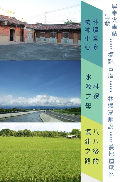 屏東火車站集合(飛馬飯店對面)→林邊永樂社區巡禮(福記古厝、林邊溪、養地種電區及八甲頭埤三支線)→午餐→鮮饌道海洋食品文化館(鱈魚香絲DIY體驗)→大鵬灣遊湖→快樂賦歸